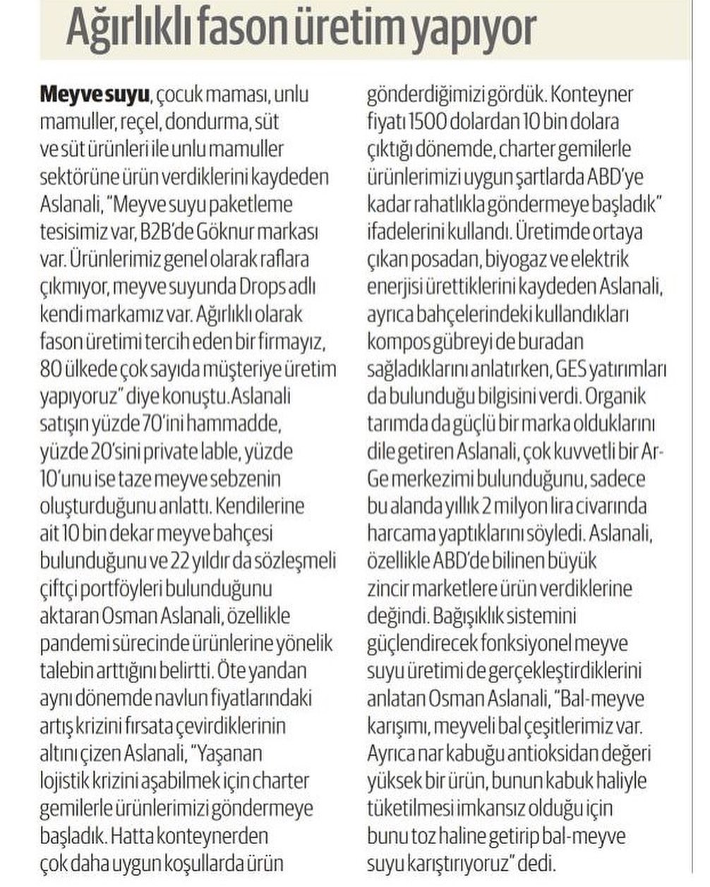 Göknur Gıda CEO Osman Aslanali's interview with Dünya Newspaper has been published.